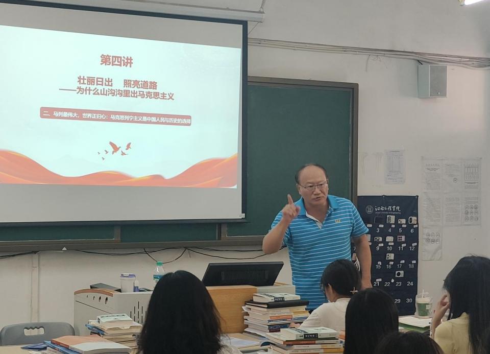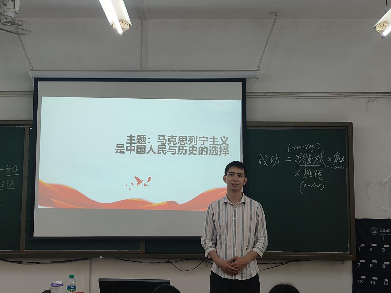 课堂上,肖鹏老师以“马克思列宁主义是人民与历史的选择”为核心主题,搭建起“史料+案例+思考”的教学框架。他通过梳理近代中国思想演进史料、剖析经典历史案例,既系统阐释红色文化的核心内涵,又结合当下时代发展解读其现实意义。整堂课教学思路清晰连贯,语言生动且富有感染力,既有理论深度的“厚度”,又有联系实际的“温度”,在引导学生从红色文化中汲取精神养分的同时,更带动起活跃的课堂氛围,师生互动频繁、思维碰撞热烈。
