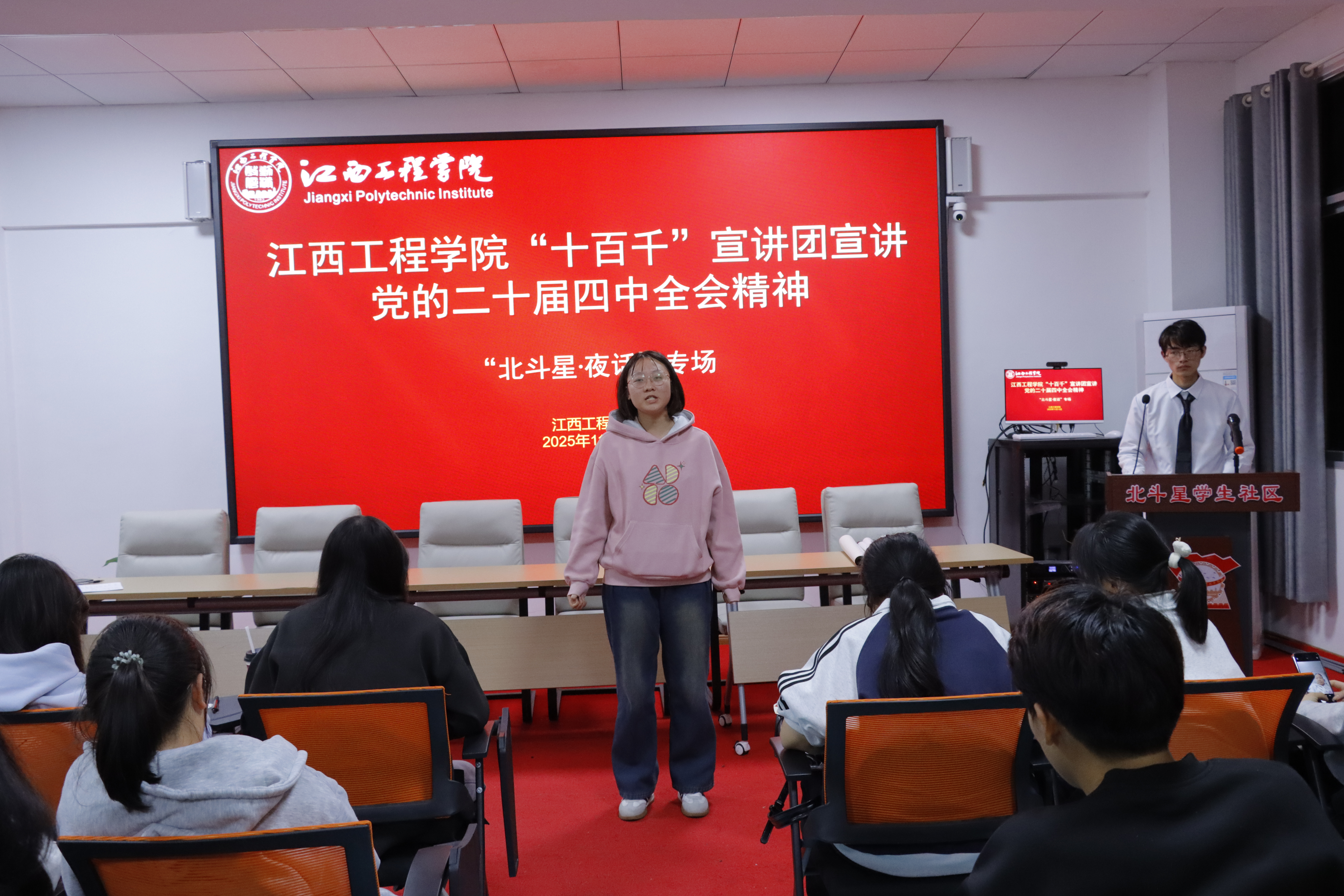 11月13日,“北斗星・天工夜话”第13期活动在江西工程学院“一站式”学生社区如期举行。本次宣讲以“身边事”解读“大政策”,真正实现“声入人心、情入人心、理入人心”。活动特别邀请江西工程学院马克思主义学院教师刘彩芸、墨韵书社负责人黄海平担任宣讲嘉宾,经济管理学院60余名学生参与其中。