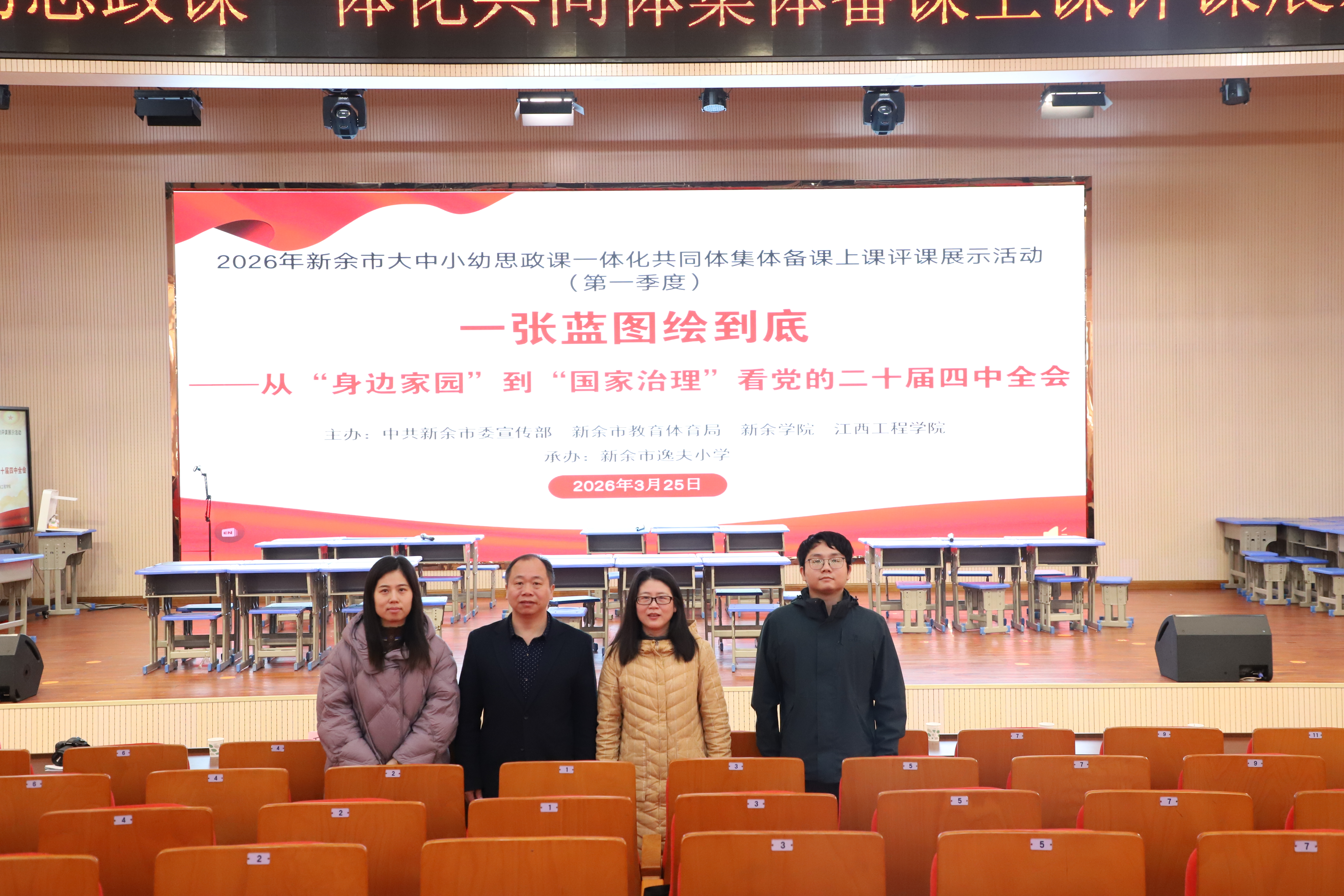 为深入贯彻《教育强国建设规划纲要(2024-2035年)》精神,扎实推进新余市大中小幼思政课一体化建设,2026年3月25日,由中共新余市委宣传部、新余市教育体育局、新余学院、江西工程学院联合主办的2026年全市大中小幼思政课一体化共同体集体备课、上课、评课活动在市逸夫小学正式启幕。作为主办方之一,江西工程学院高度重视此次活动,组织马克思主义学院的于永清、黄琴、刘丽、周理斌四位思政课教师全程参与,与全市四百余名思政教育工作者齐聚一堂,共研党的二十届四中全会精神,共商思政育人协同路径。